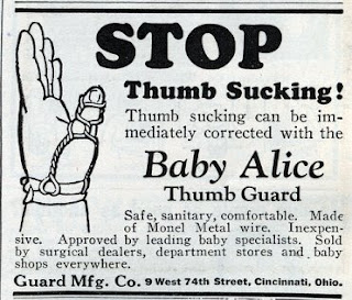 This ad is from 1920s... Woh-keyyyy... I actually have no idea on how putting this thumb guard can stop baby from sucking their thumbs and actually wonders whether baby's thumb growth might be impeded when they had to wear this?...